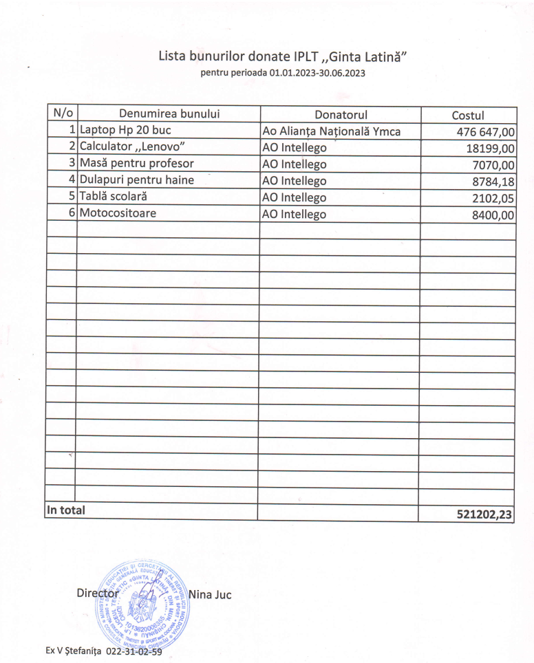 LISTA bunurilor donate IPLT "Ginta Latină" (01.01.2023 - 30.06.2023)