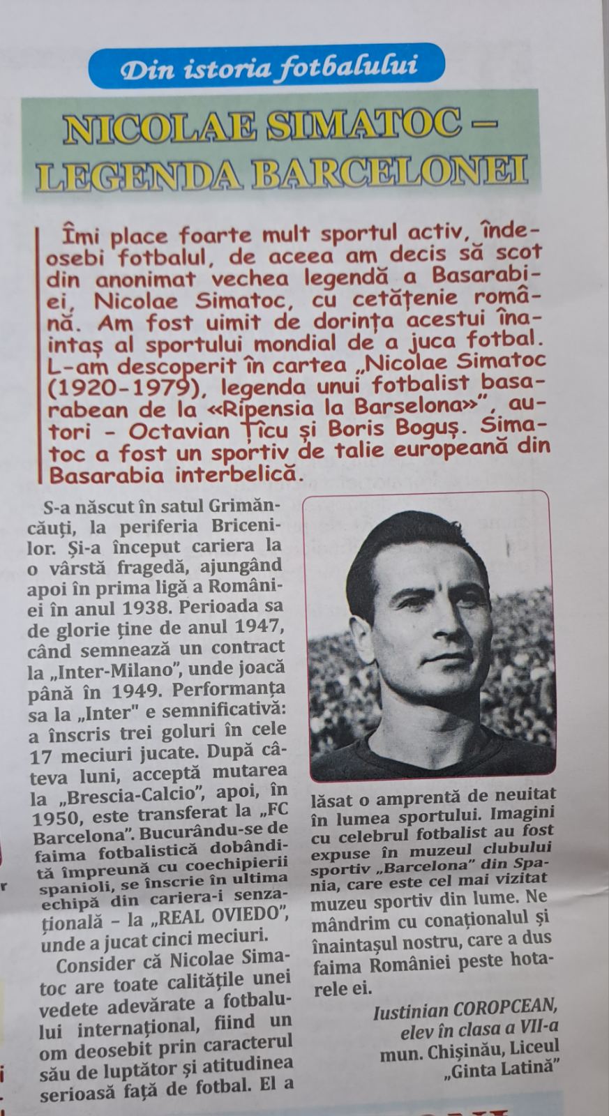 „Nicolae Simatoc – Legenda Barcelonei” este un articol, pe care elevul clasei a VII-a Coropcean Iustinian a reușit să-l publice în numărul din 12 octombrie al revistei „Florile Dalbe”. Îl felicităm pentru reușita sa și îi dorim mari succese pe tărâmul jurnalismului!