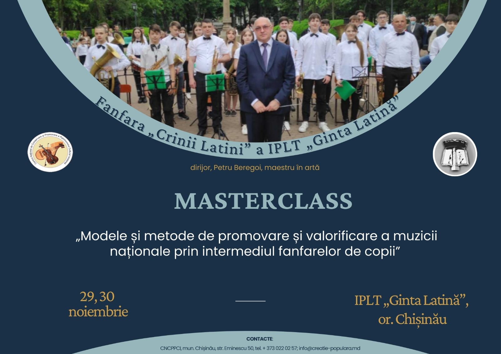 În scopul perfecţionării activităţii de creaţie a dirijorilor fanfarelor de copii, realizării schimbului de experienţă între conducătorii colectivelor şi îmbogăţirii programelor artistice ale fanfarelor cu aranjamente folclorice, Centrul Naţional de Conservare şi Promovare a Patrimoniului Cultural Imaterial, în colaborare cu Orchestra de fanfară a IPLT „Ginta Latină” din or. Chișinău, a organizat masterclassul „Modele și metode de promovare și valorificare a muzicii naționale prin intermediul fanfarelor de copii”, formator Petru Beregoi,  Maestru în Artă.